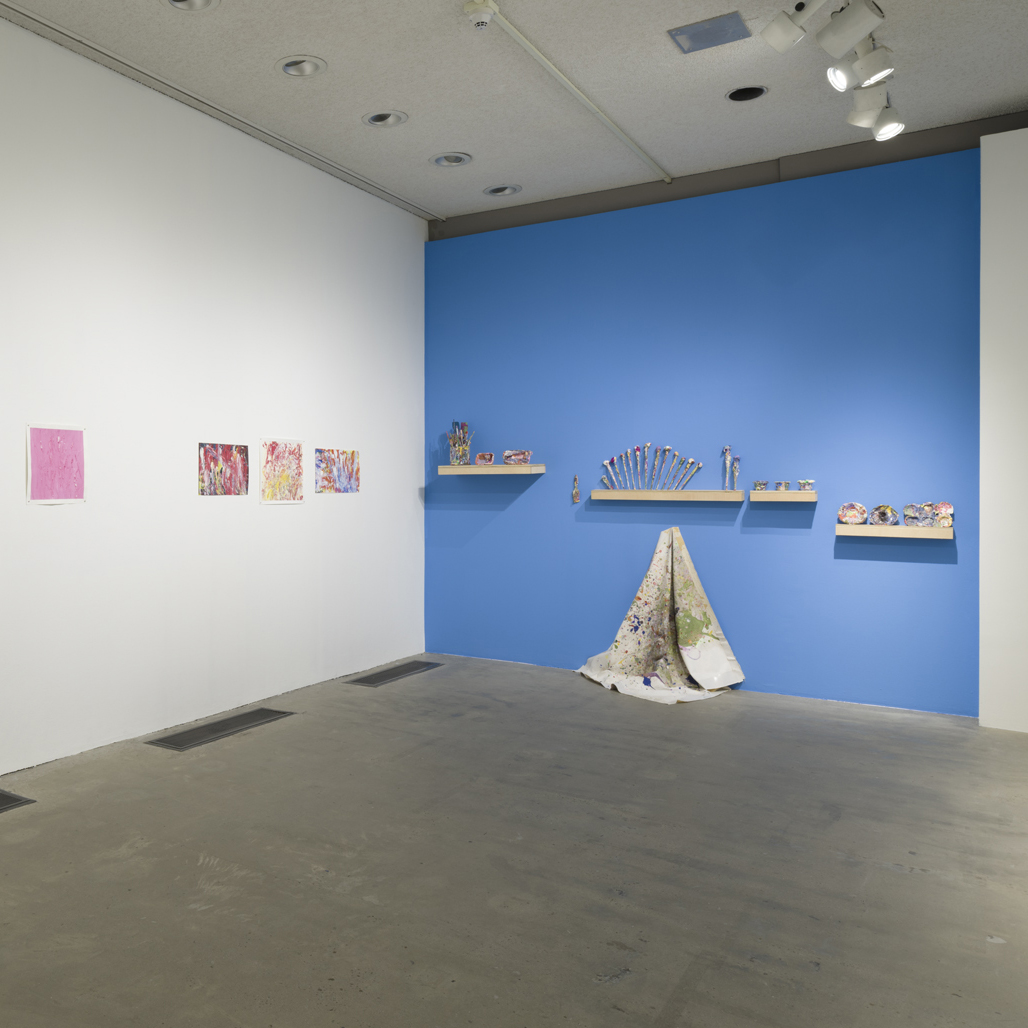 Vanessa McConnell’s exhibition presented a selection of recent paintings and works on paper characterized by their thick impasto surfaces and decisive brushstrokes. McConnell creates densely textured abstract compositions by adding multiple layers of acrylic paint, often working until her brush is too heavy with paint to be manipulated. The expressive nature of her mark-making, which sometimes leads to tears and rips in the paper, evinces the artist’s powerful compulsion to paint. The exhibition also featured a selection of ephemera generated by McConnell’s distinctive process, including a series of paint-drenched brushes and vessels from the studio, that have acquired a lacquered appearance over time.